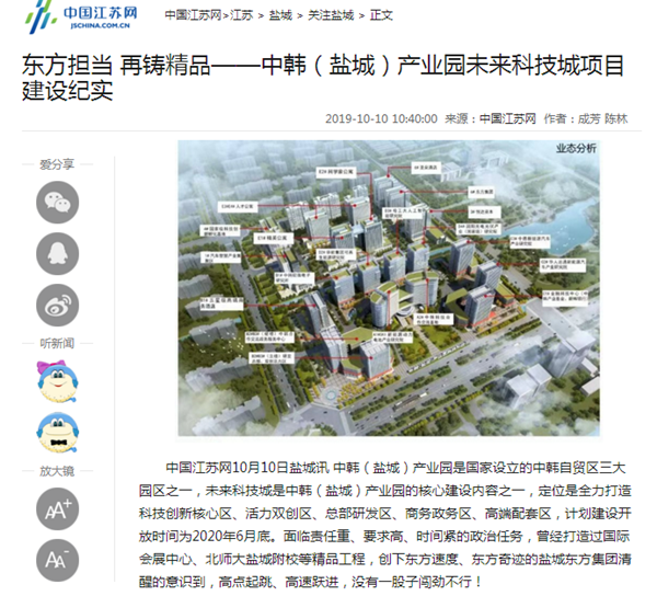 中韓(鹽城)產業園是國家設立的中韓自貿區三大園區之一,未來科技城是中韓(鹽城)產業園的核心建設內容之一,定位是全力打造科技創新核心區、活力雙創區、總部研發區、商務政務區、高端配套區,計劃建設開放時間為2020年6月底。面臨責任重、要求高、時間緊的政治任務,曾經打造過國際會展中心、北師大鹽城附校等精品工程,創下東方速度、東方奇跡的鹽城東方集團清醒的意識到,高點起跳、高速躍進,沒有一股子闖勁不行!