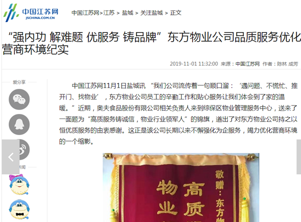 “我們公司流傳著一句順口溜:‘遇問題、不慌忙、推開門、找物業(yè)’,東方物業(yè)公司員工的辛勤工作和貼心服務(wù)讓我們體會(huì)到了家的溫暖。”近期,奧夫食品股份有限公司王總來到綜保區(qū)物業(yè)管理服務(wù)中心,送來了一面題為“高質(zhì)服務(wù)鑄誠(chéng)信,物業(yè)行業(yè)領(lǐng)軍人”的錦旗,道出了對(duì)東方物業(yè)公司持之以恒優(yōu)質(zhì)服務(wù)的由衷感謝。這正是該公司長(zhǎng)期以來不懈強(qiáng)化為企服務(wù),竭力優(yōu)化營(yíng)商環(huán)境的一個(gè)縮影。