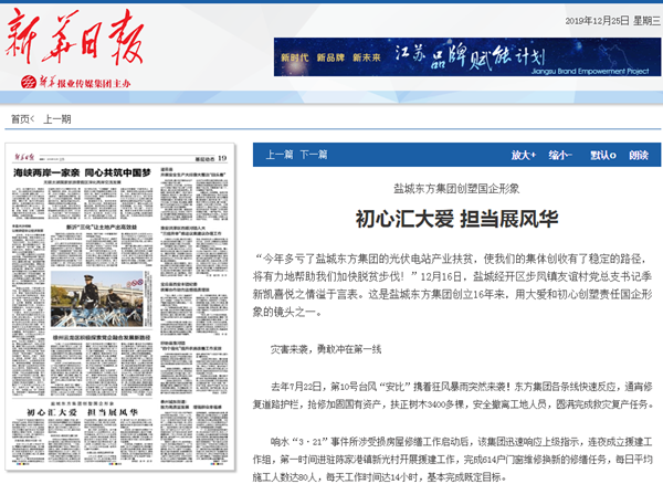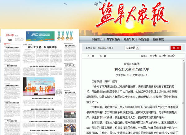 12月24日、25日,《新華日報》顯著版面重要位置、《鹽阜大眾報》A4版頭條,均以“初心匯大愛 擔當展風華”為主題,用生動的筆觸、鮮活的鏡頭,對鹽城東方集團積極踐行責任關懷進行了報道,充分彰顯了新時代的國企形象。