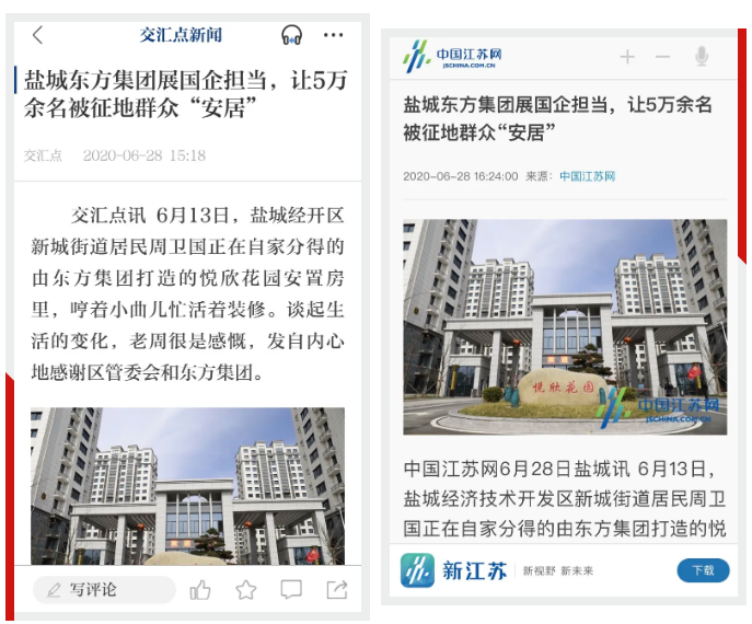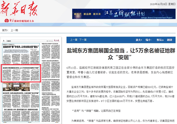 2020年6月28日《新華日報》第4版:“一線視點”刊發《鹽城東方集團展國企擔當,讓5萬余被征地群眾“安居”》。