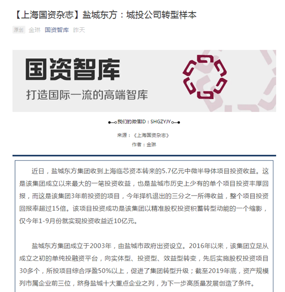 對此,鹽城東方成功“出圈”,在省內外乃至長三角主流媒體圈激起陣陣漣漪。近日,繼《新華日報》發表“鹽城東方集團:股權投資結碩果 轉型升級勢頭勁”,《鹽阜大眾報》整版報道“鹽城東方集團:深度接軌上海 打造轉型樣板”后,12月15日,《上海國資》雜志以“鹽城東方:城投公司轉型樣本”為題,深度報道東方集團如何以敢闖敢干的勇氣和自我革新的擔當,實現精準的股權投資,開放的管理體系,描繪高質量東方發展新圖景。“國資智庫”公眾號同期轉載。