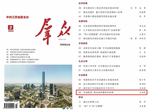近日,由中共江蘇省委主辦的《群眾》雜志(思想理論版)2022年3月刊“社會建設(shè)”欄目刊登王旭東董事長署名文章——《尋道圖強 推動高質(zhì)量轉(zhuǎn)型發(fā)展》。