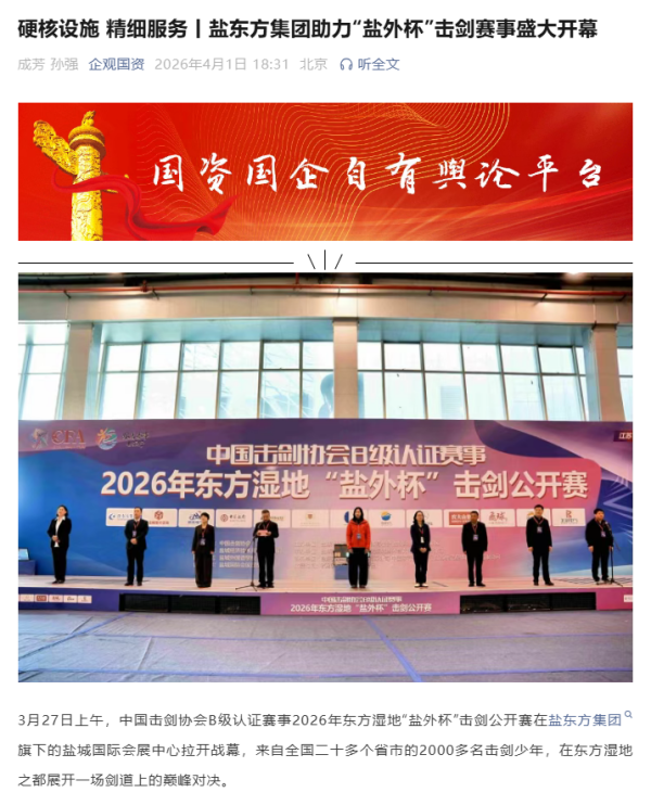 近日,《企觀國資》報道了鹽東方集團以硬核設(shè)施、精細服務(wù)助力2026年東方濕地“鹽外杯”擊劍公開賽盛大開幕的新聞。近年來,鹽東方集團依托鹽城國際會展中心平臺,不斷豐富會展活動服務(wù)內(nèi)涵、完善服務(wù)功能,切實承接好、放大會展溢出效應(yīng),推動會展資源與產(chǎn)業(yè)發(fā)展同頻共振、提質(zhì)增效,為區(qū)域經(jīng)濟高質(zhì)量發(fā)展注入了新動能。