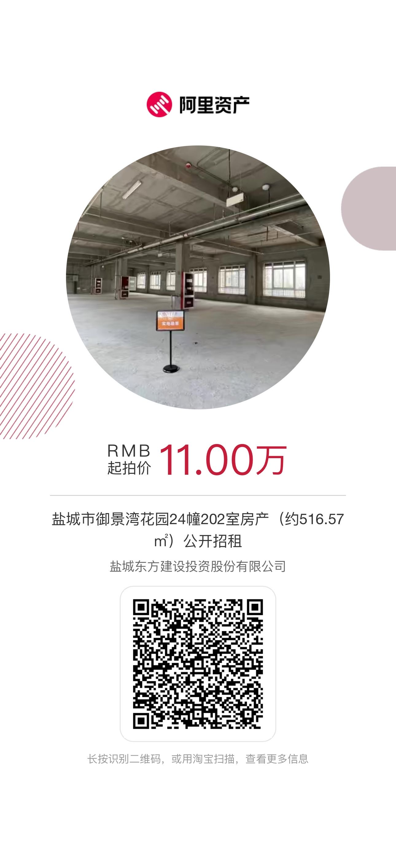 鹽城東方建設投資股份有限公司將于2024年4月24日10時起至2024年4月25日10時止(延時的除外),在阿里拍賣平臺對御景灣花園24#202室(商業)進行公開招租,建筑面積516.57平方米,按現狀招租,免租期2個月,租賃底價:110000元/年。加價幅度:2000元整或整倍數,租賃期限為五年。