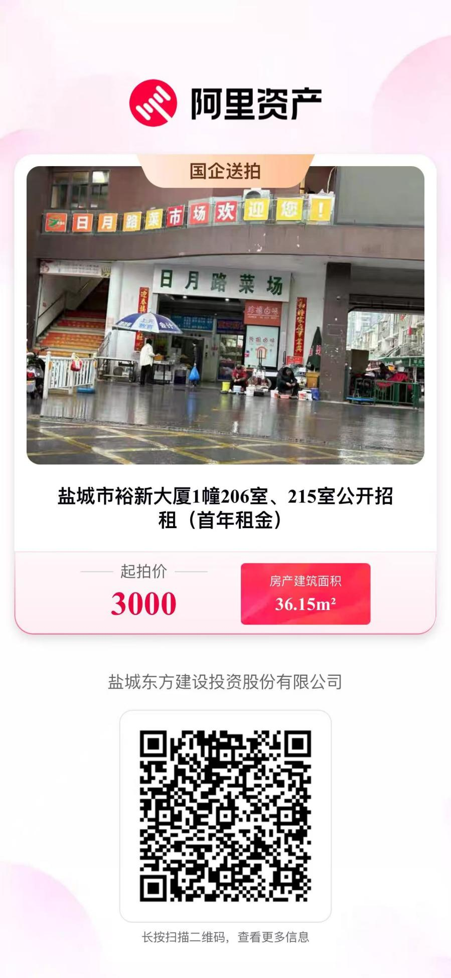 鹽城市東方融資有限公司將于2026年4月16日10時起至2026年4月17日10時止(延時除外),在阿里拍賣平臺對鹽城市裕新大廈1幢206室、215室進行公開招租,價高者得,具體為: