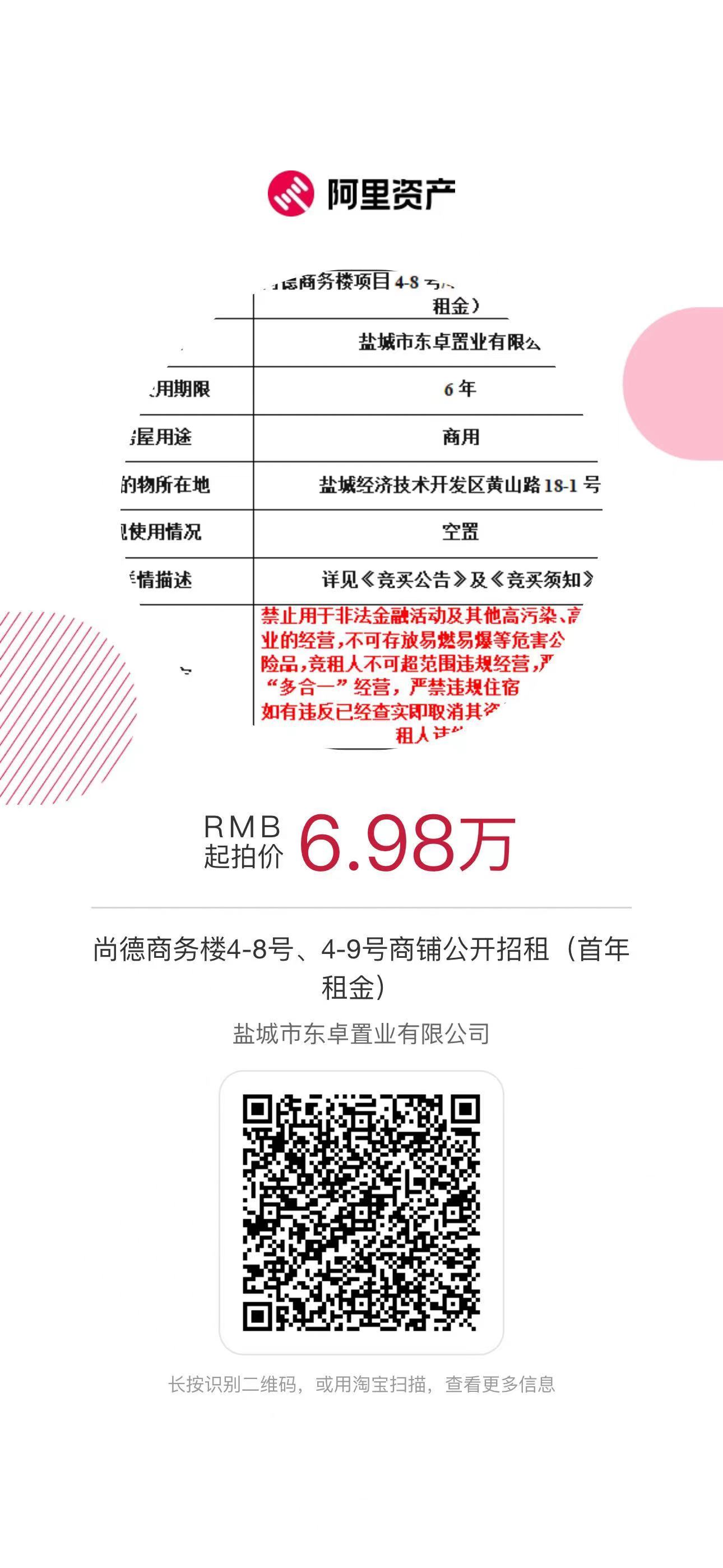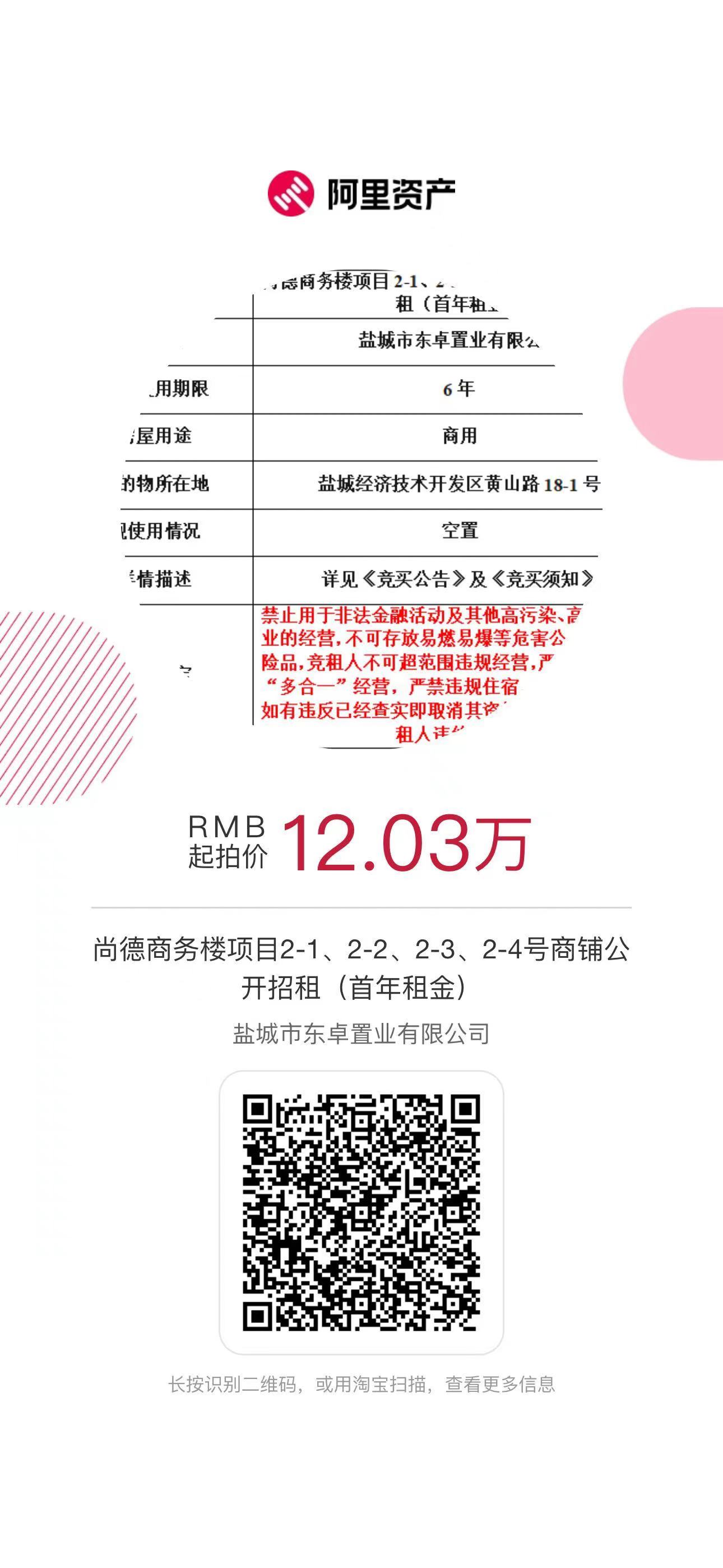 鹽城市東卓置業有限公司將于2023年6月16日10時起至2023年6月17日10時止(延時除外),在阿里拍賣平臺對鹽城經濟技術開發區黃山路18-1號尚德商務樓項目部分商鋪進行公開招租,價高者得,具體為: