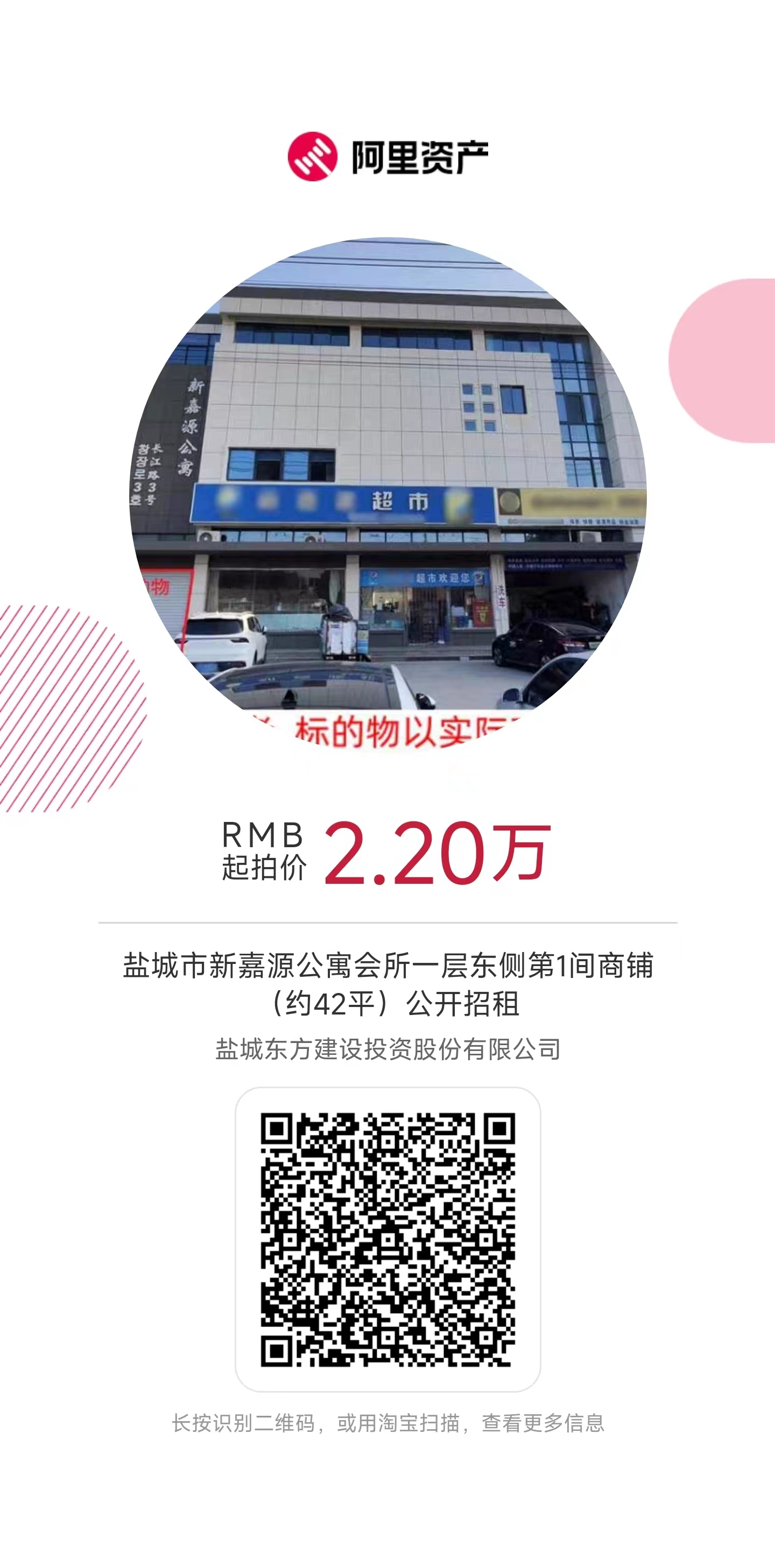 鹽城東方新天地置業有限公司將于2024年1月12日10時起至2024年1月13日10時止(延時除外),在阿里拍賣平臺對鹽城經濟技術開發區長江路3號新嘉源公寓會所一層東側第1間商鋪(約42平)公開招租,免租期2個月,租賃起拍價:22000元/年。上述房產加價幅度:500元整或整倍數,租賃期限3年。
