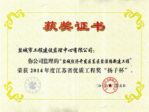 東方市政公司承建的鹽城經(jīng)濟技術(shù)開發(fā)區(qū)東區(qū)鹽瀆路新建工程榮獲2014年度江蘇省優(yōu)質(zhì)工程獎“揚子杯”