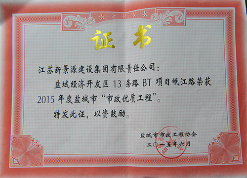 東方市政公司承建的鹽城經(jīng)濟技術(shù)開發(fā)區(qū)13條路BT項目嘉陵江路、岷江路榮獲2015年度鹽城市“市政優(yōu)質(zhì)工程”
