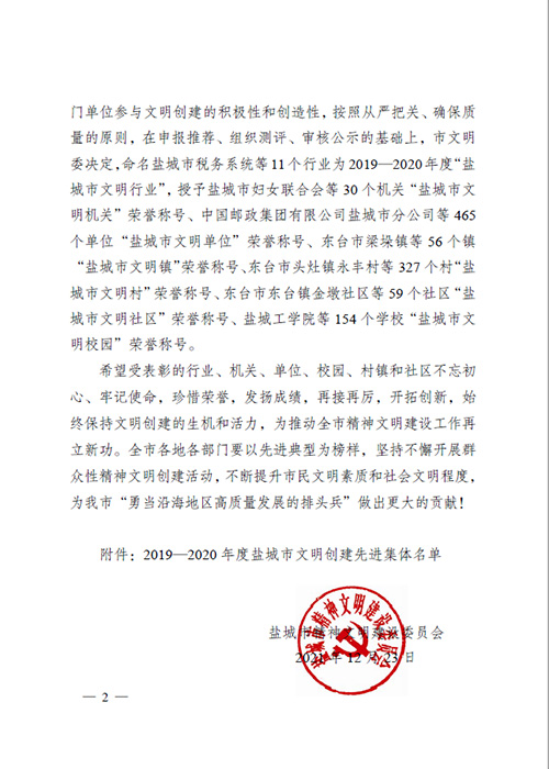 集團榮獲中共鹽城市委、鹽城市人民政府頒發(fā)的“創(chuàng)建全國文明城市工作先進(jìn)單位”獎項。