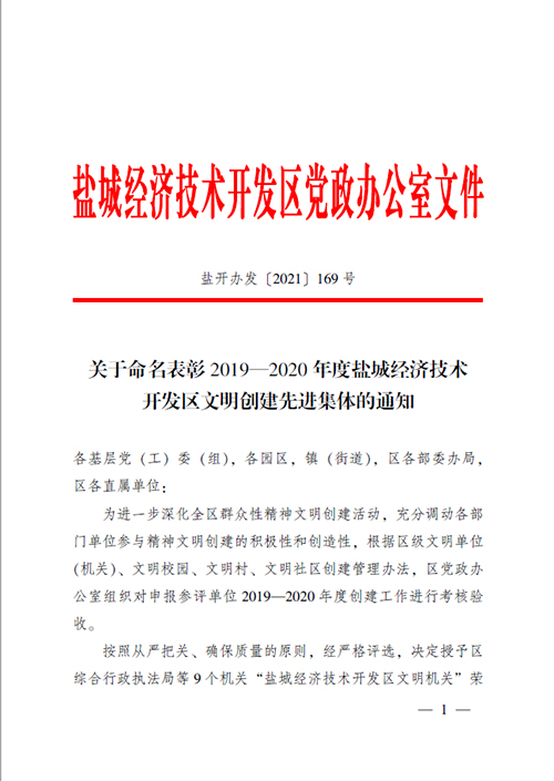 榮獲2019年度鹽城經(jīng)濟技術(shù)開發(fā)區(qū)綜合工作先進(jìn)獎。