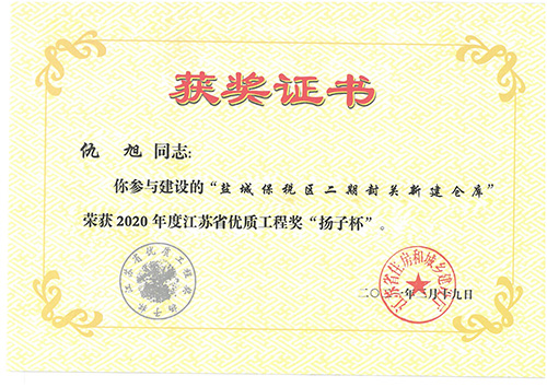 鹽城綜保區(qū)二期封關(guān)新建倉庫榮獲2020年度江蘇省優(yōu)質(zhì)工程“揚子杯”。