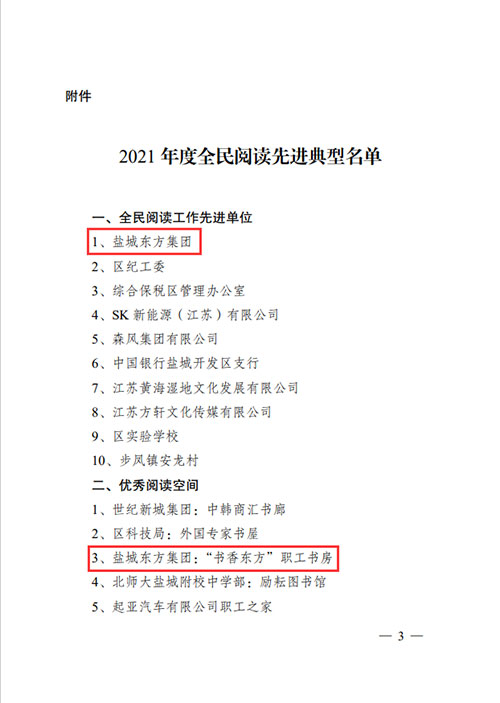 鹽城東方集團榮獲2021年度區(qū)全民閱讀工作先進(jìn)單位;鹽城東方集團”書香東方”職工書房榮獲區(qū)優(yōu)秀閱讀空間。